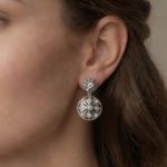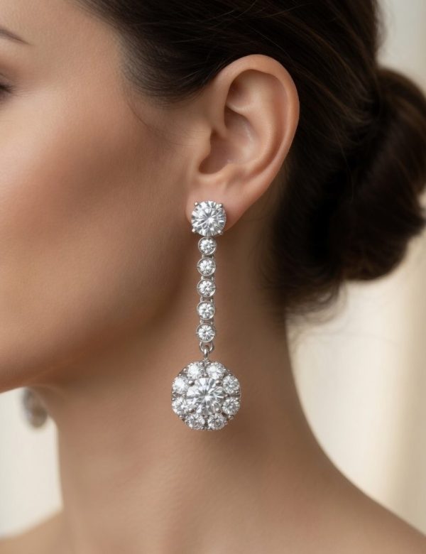 Pendientes largos de novia con tres cuerpos para darle movilidad, son muy estilosos, tienen un largo total de 25 mm, con cierre de presión. Hechos en oro blanco de 18k (1ª Ley).
