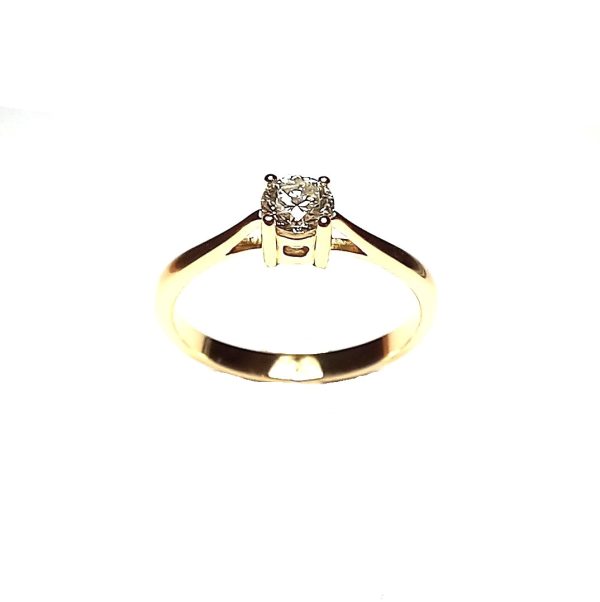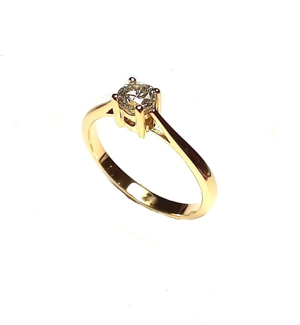 Solitario en diamante talla brillante, con 0,25 Ctes, engastado con cuatro patillas redondeadas, es un diseño ideal para pedida ó para una ocasión especial. Hecho en oro amarillo de 18K ( 1ª Ley ).