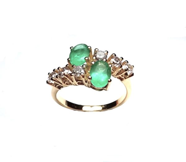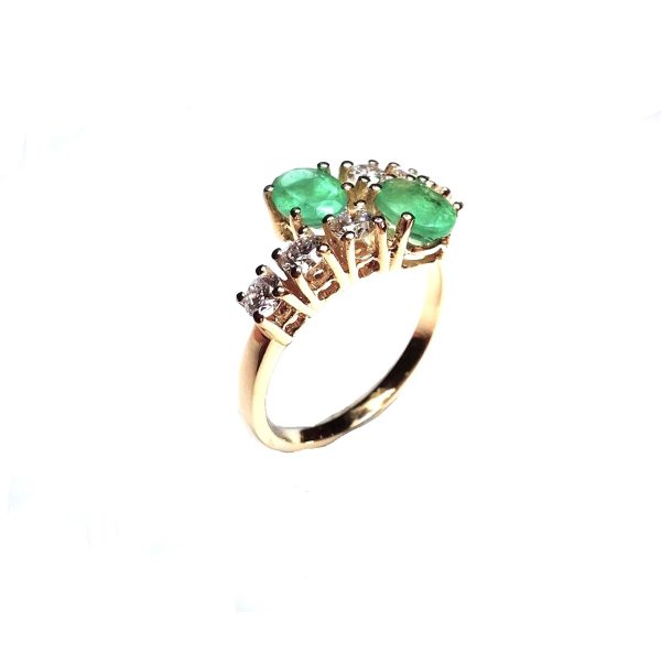 Sortija de diamantes y esmeraldas, con 6 diamantes talla brillante con un peso de 0,50 ctes y 2 esmeraldas en forma oval con un peso de 0,90 ctes. Hecho en oro amarillo de 18K (1ªLey).Todos nuestros diamantes son naturales, se entregan con certificado.